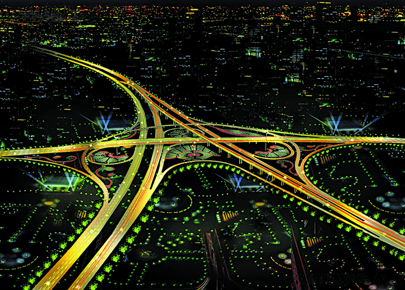 廣州新機(jī)場(chǎng)互通立交是新國(guó)際機(jī)場(chǎng)進(jìn)入廣州市的第一個(gè)互通式立交,新機(jī)場(chǎng)高速路、高速路北延段及106國(guó)道在此形成五路交叉。項(xiàng)目根據(jù)道路等級(jí)和轉(zhuǎn)向流量,高速路采用定向式主線,高速路之間采用定向和半定向匝道,國(guó)道與高速路之間左轉(zhuǎn)采用環(huán)形匝道,花都市與新機(jī)場(chǎng)之間采用定向匝道,其余右轉(zhuǎn)采用定向地面道路聯(lián)系。整個(gè)立交線形流暢、造型美觀。
