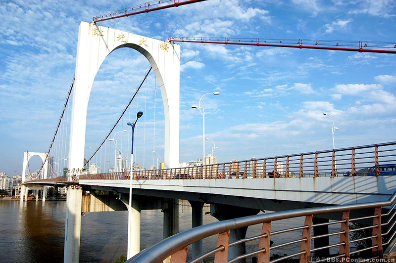 紅光大橋工程全長1.04公里,主橋采用跨度為380m的地錨式懸索橋,一跨過江,橋?qū)?7.8m,是目前廣西壯族自治區(qū)跨度最大的橋梁,也是柳州市第一座懸索橋梁。
