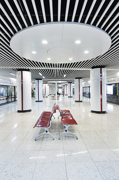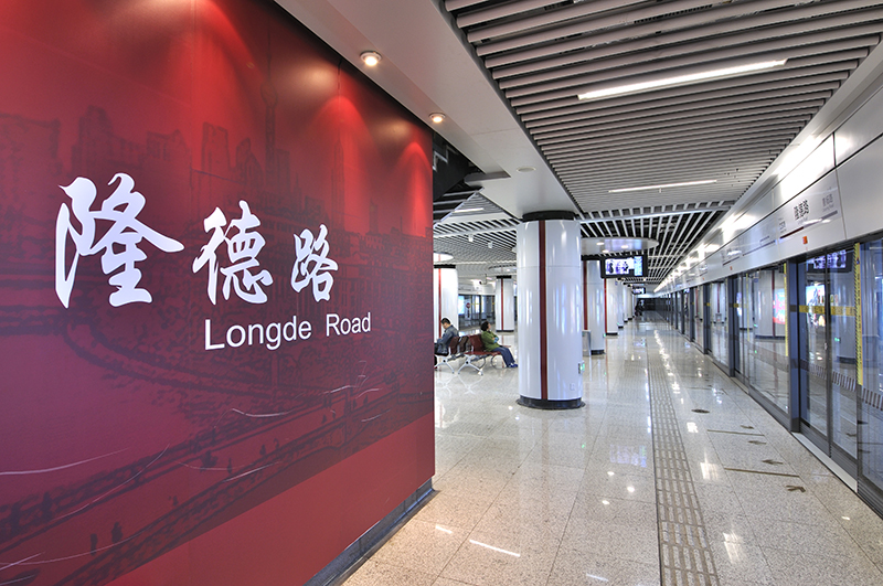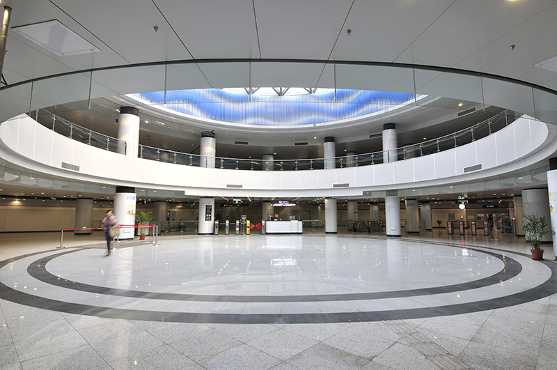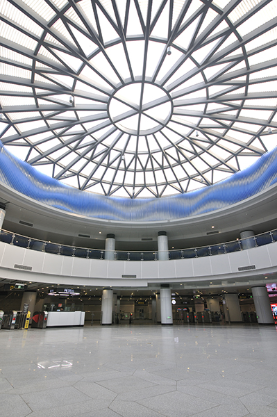 軌道交通11號線隆德路站位于普陀區(qū)曹楊路、隆德路交叉口的東側(cè)地塊內(nèi),與沿隆德路走向的規(guī)劃13號線形成“十”字換乘,11號線為地下三層站,13號線為地下四層站。在兩線交匯區(qū)域設(shè)橢圓形中庭共享空間,通過頂板的采光穹頂將自然環(huán)境光引入地下車站。