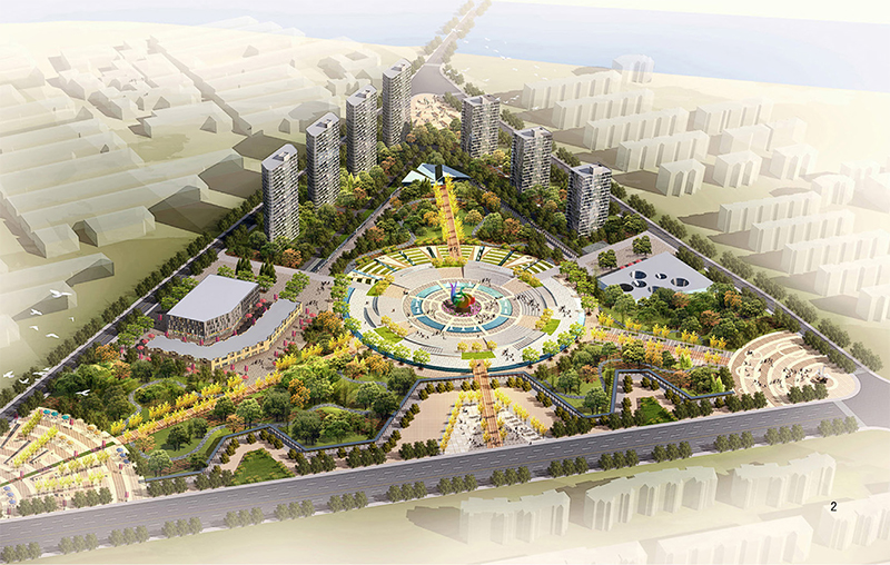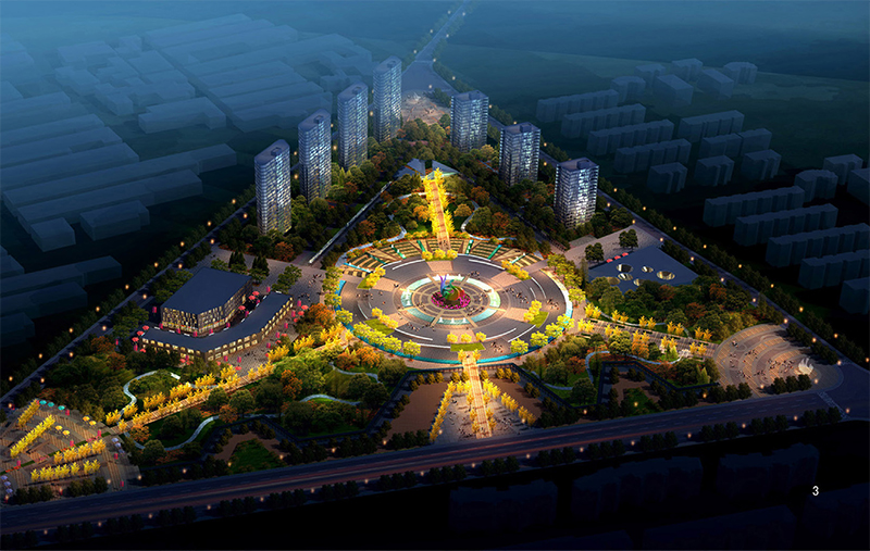 本項目占地:275 畝,寶坻區(qū)位于天津市北部,地處京、津、唐三角地帶,臨近渤海灣?;貫槿切斡玫?,形狀不規(guī)整。取圓形作為設(shè)計要素,將尖銳的地形柔化。設(shè)計中將廣場定位為城市開放廣場,將城市各種功能融入其中,人與場地互動,享受生活,感受自然。
