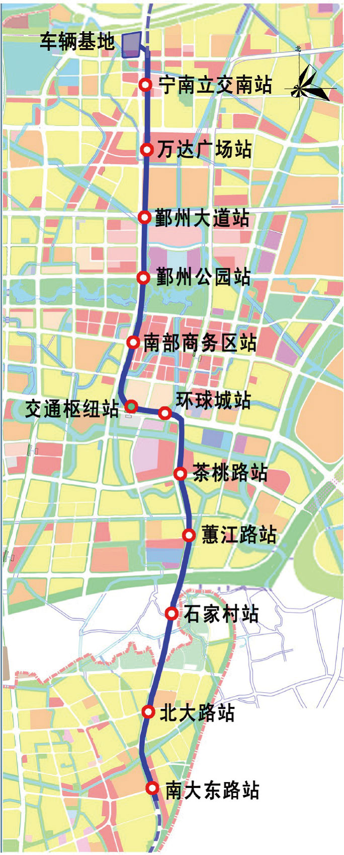 寧波市鄞州區(qū)現(xiàn)代有軌電車實(shí)驗(yàn)線一期工程線路全長8.16km,聯(lián)系鐘公廟、首南、姜山,覆蓋西側(cè)客流走廊,一期線路長約8.1公里,設(shè)站12座,地面敷設(shè),預(yù)留向北延伸條件,平均站間距723m,最大站間距1018m,最小站間距469m,全線設(shè)置12座車站、一座車輛基地和一個(gè)控制中心。